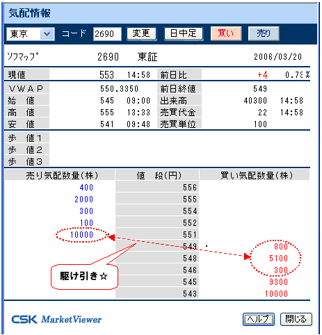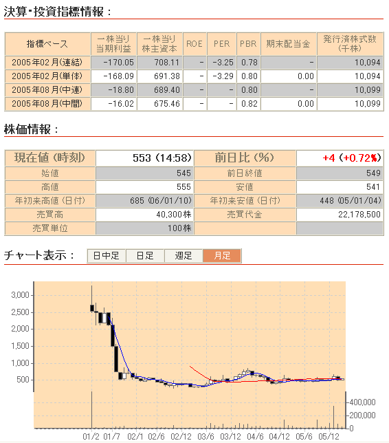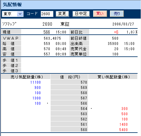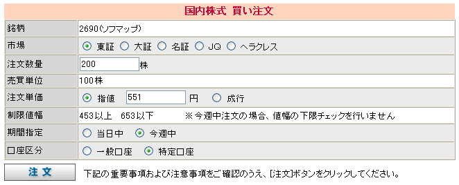 ってことで初めての買い注文。 銘柄:ソフマップ 日興イージートレードでいってみます。 ここのボードでみると、この画像の感じです。 なんでソフマップなのかっていうと・・・ アタシがド素人だからです(笑 東証のチャートで見ると、この画像。 IPO売り出しの時は高かったらしい。その後はずるずる下がって、でもずっと極端な変動が無い。下がった今時点の株価で、100株単位で買える銘柄ってそんなにないし。 赤字決算だから値下がりしてんですよね。PERもへったもないですw 黒字決算になったらすぐ伸びるだろうと。 お試しに丁度いいと思って。 この画像が、日興イージートレードの発注画面です。 551円、200株、買い! さて、どうなるんだろ?(・∀・) |