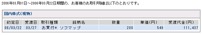 音沙汰ありまへん。(´・ω・`) IPO乞食だと思われたのかな?(´・ω・`) じゃ、めげすに楽天証券にも口座開設トライしてみよう。 楽天証券は手数料が安いから、IPO狙いよりも普通にトレードするにはいいんだって☆(・∀・) 昨日「買い」が成立したソフマップはあまり値動きありません。 上がり方向ではあります☆ |
